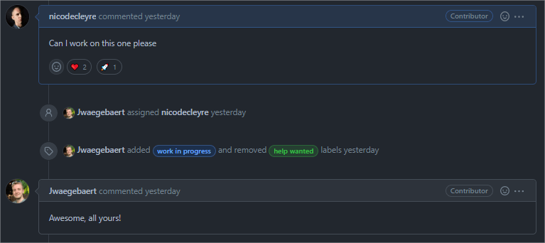 If you have chosen an issue that interests you, you can open it and leave a comment field in which you indicate that you would like to claim that issue and ask to assign you. Shortly after you leave this comment on an issue, a maintainer will assign you.