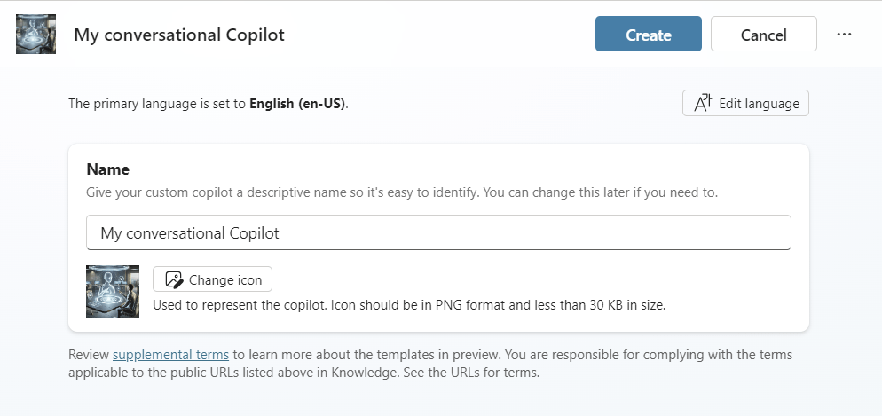 Next, give your Copilot action a suitable name. If desired, give it a suitable icon and then click on Create.