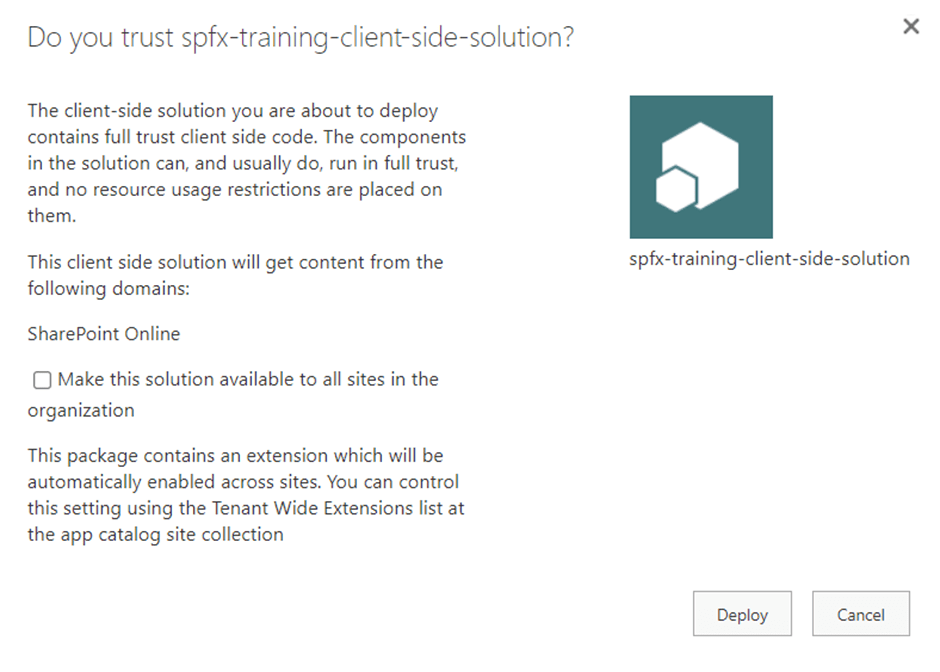 If you check “Make this solution available to all sites in the organization”, the clientSideInstance.xml file will be used and the extension will be implemented in the Tenant Wide Extensions list. If you don’t find this option, the elements.xml file will be used when you specifically add an app to a site collection.