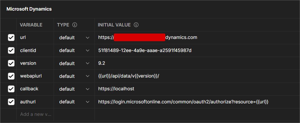 Next we need to create some variables needed to authenticate against Dynamics:
