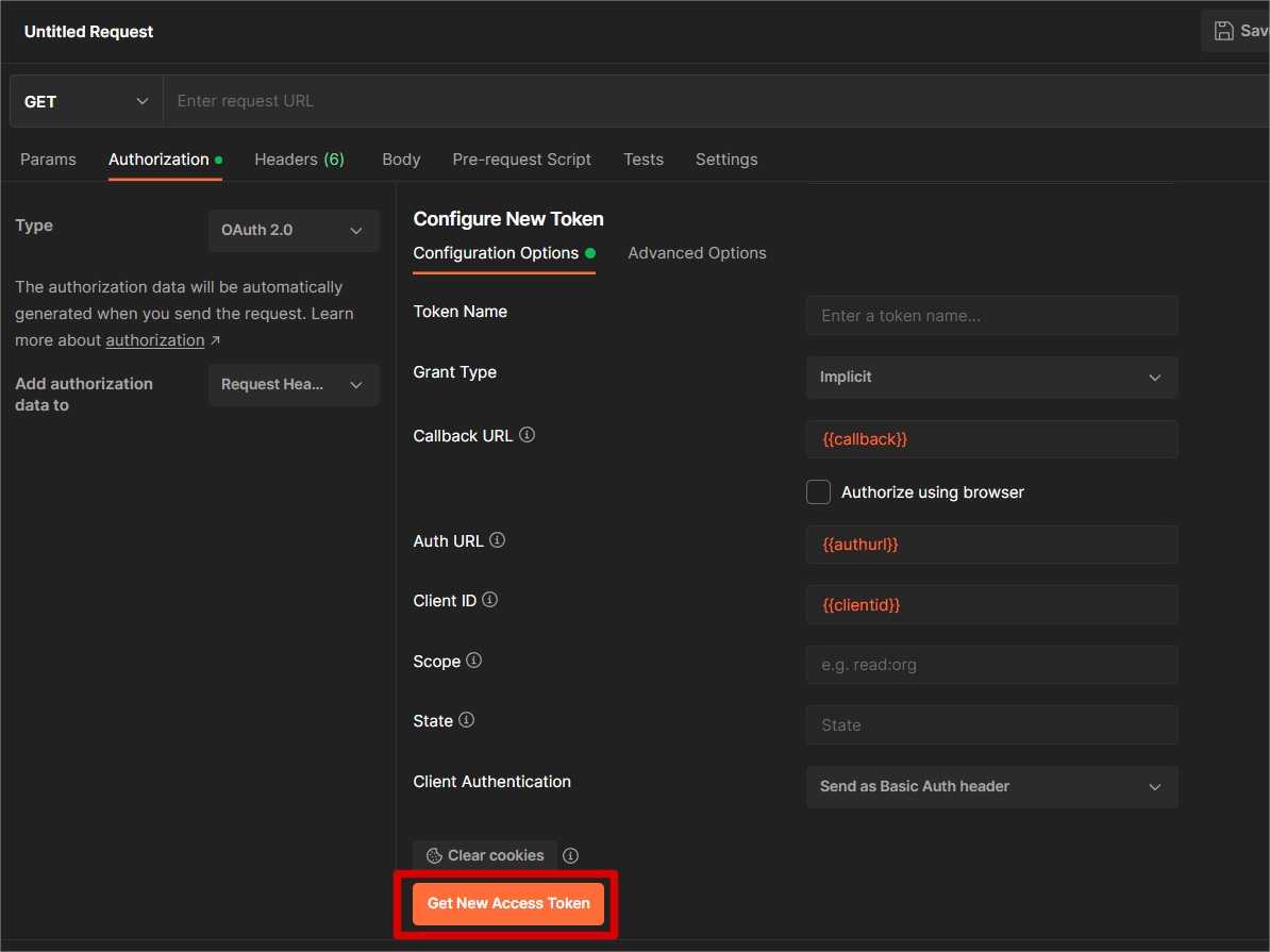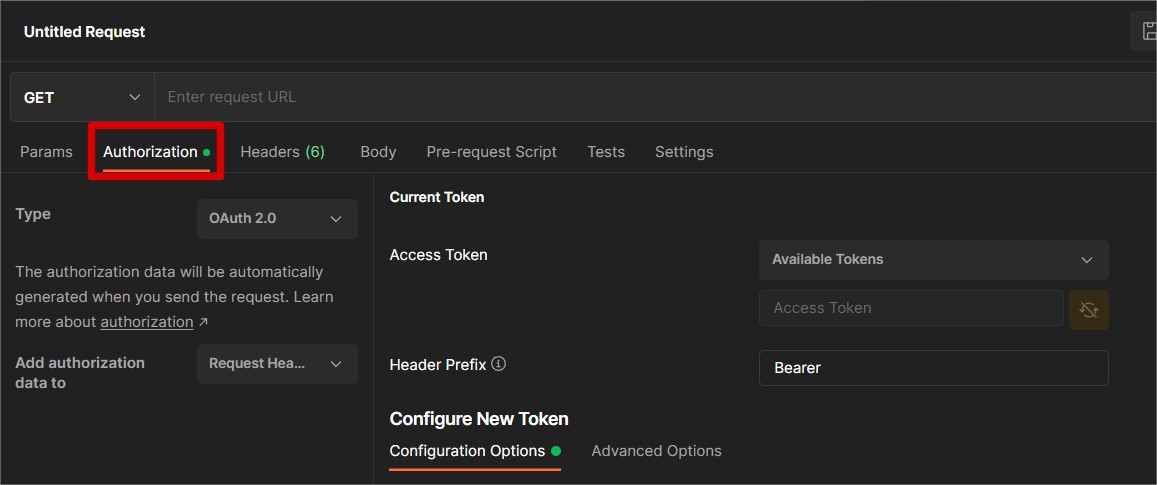 Now we are going to create a new request. With the new request you go to the Authorization tab and you select “OAuth 2.0” as type. As “add authorization data to”, you can select “Request Headers”