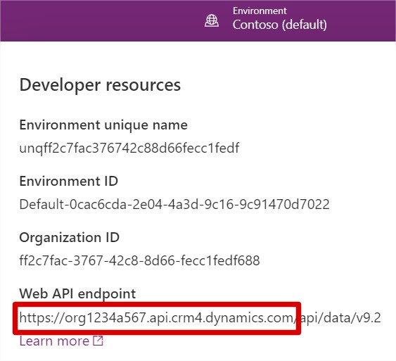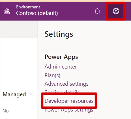 Before we continue, we need to know the Host of our dynamics web API endpoint. I obtained this by clicking on the gear wheel via Power Apps, then on ‘Developer resources’.