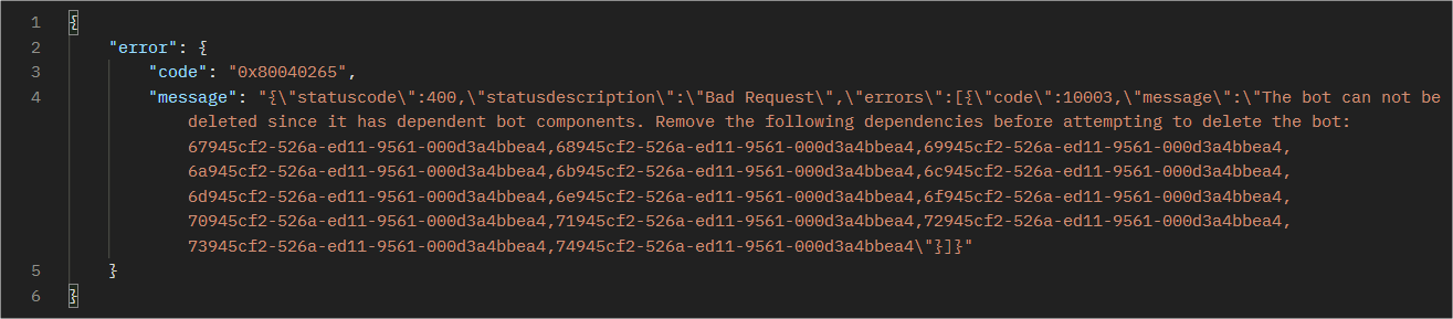 Well not really.. When you run the above api, you bump into a “400 bad request” error, stating “The bot can not be deleted since it has dependent bot components. Remove the following dependencies before attempting to delete the bot…”.