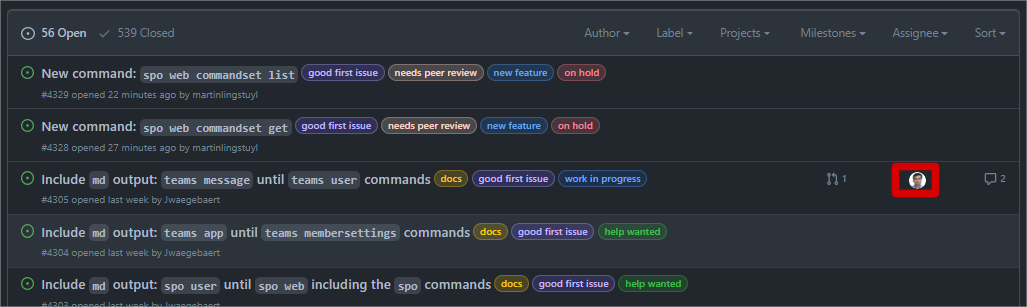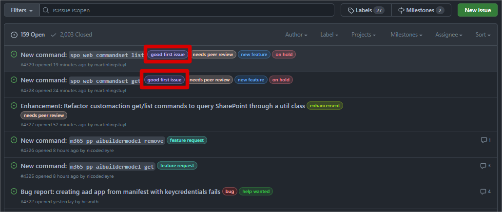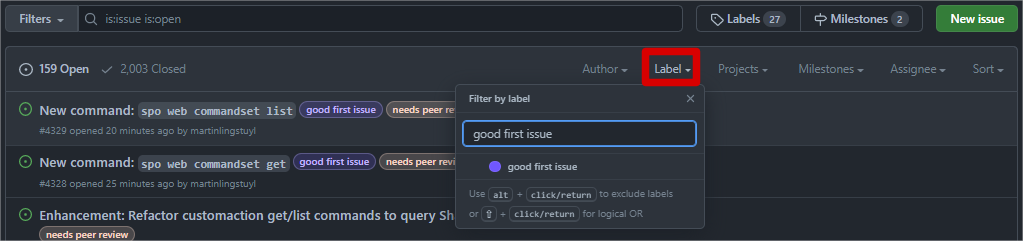 If you are just starting out as a contributor for the CLI for Microsoft 365, it is best to look at the issues labeled “Good First issue”. These issues are a little easier to start with. You can create an overview of only the issues with this label by clicking on the label somewhere,